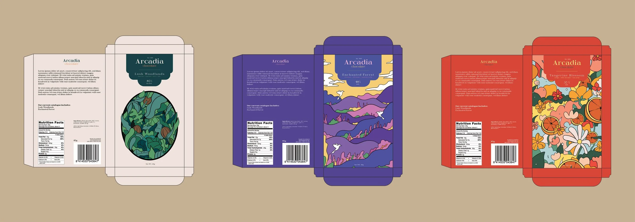 Arcadia Chocolate is known for its natural ingredients, bold character, and timeless flavors. Packaging was made to express each flavor through color and symbolic imagery. Lush Woodlands (80% cacao) is the richest out of the three flavors and features an untamed forest with greenery extending beyond its borders to symbolize it’s strength and depth. Enchanted Forest transports you to a magical landscape to visualize its unique blend of cinnamon, chili pepper, and pistachio syrup. In contrast, a vibrant color palette combined with imagery of florals and oranges is used for Tangerine Blossom to showcase its bold and refreshing blend of citrus and rose syrup. The package design was featured in Design Rush - Best Sweets Packaging Designs of 2024.