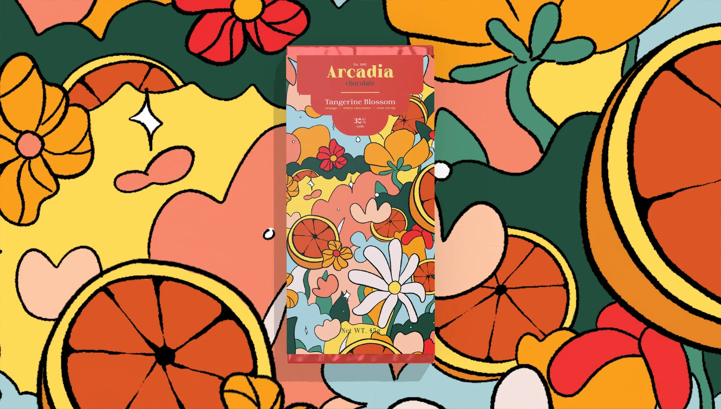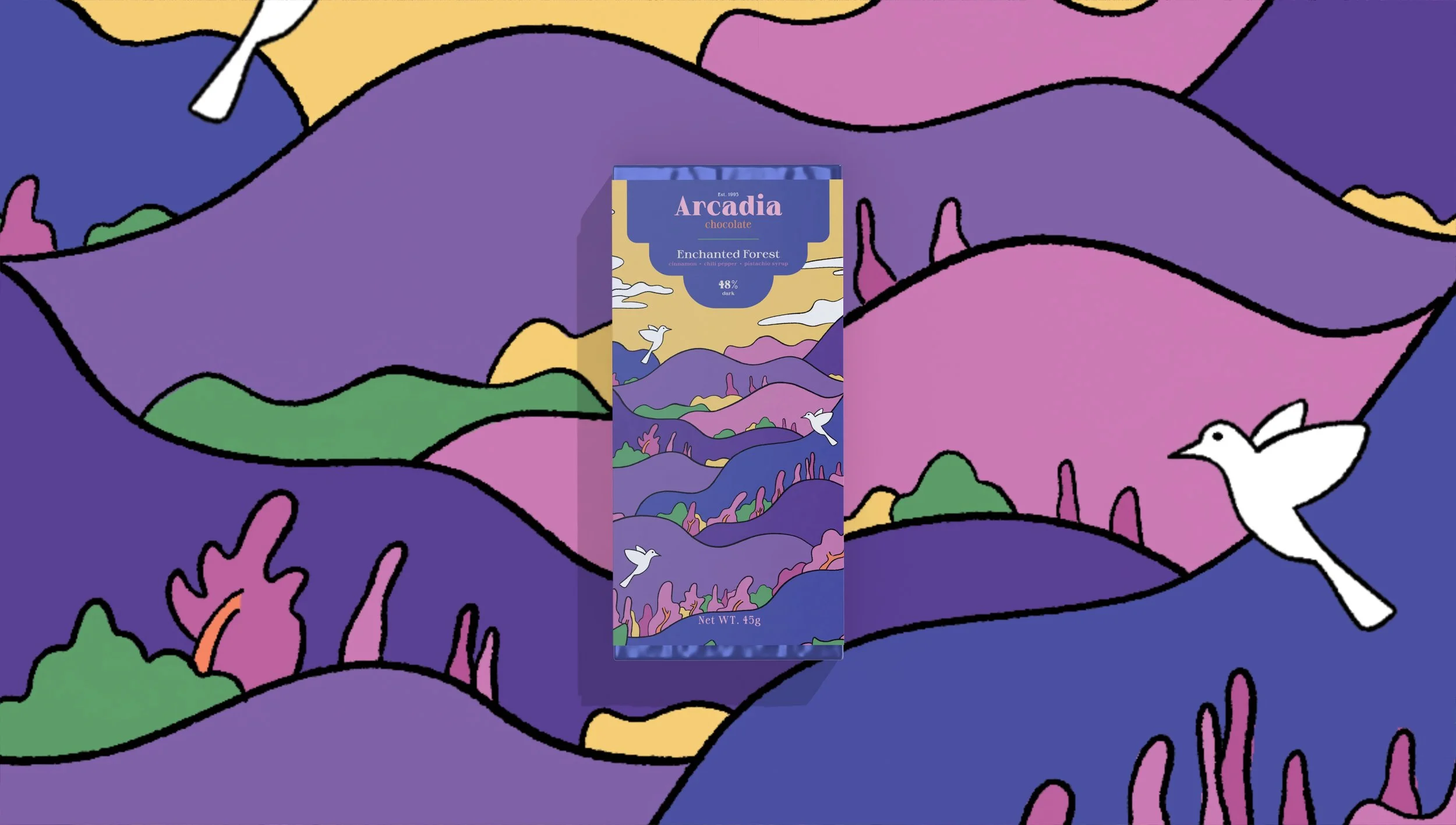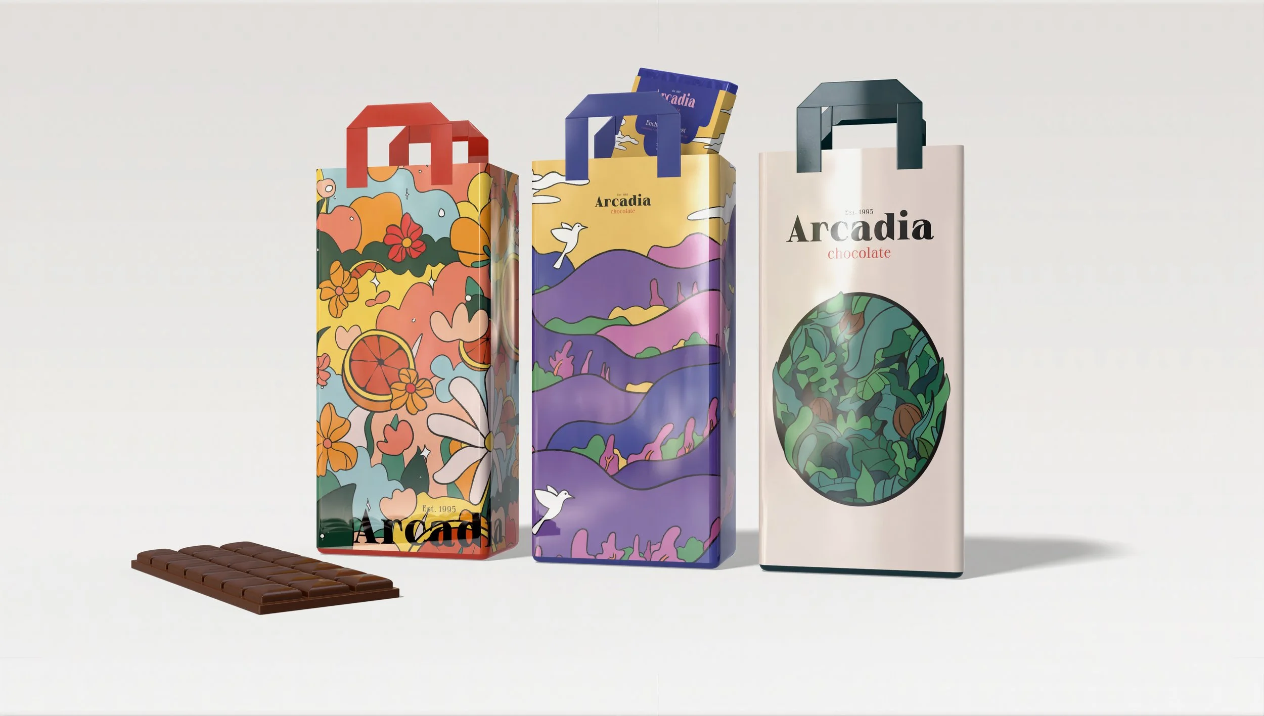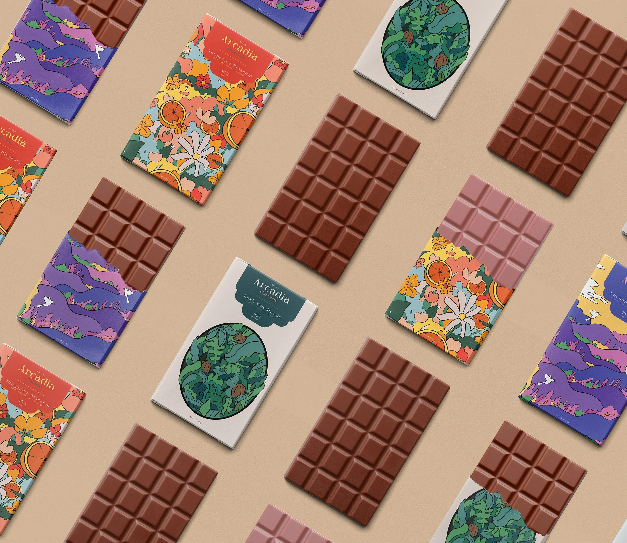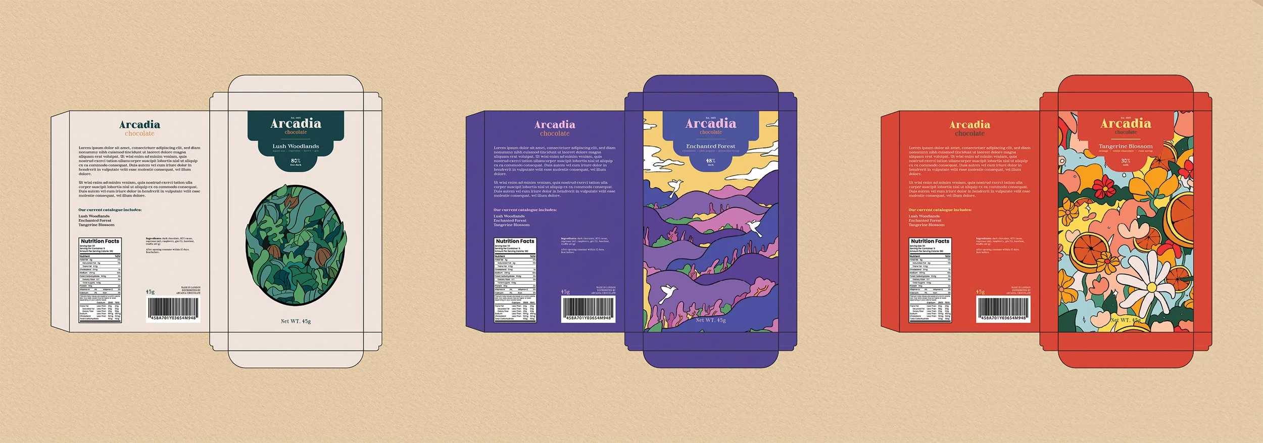 Arcadia Chocolate is known for its natural ingredients, bold character, and timeless flavors. The packaging playfully interprets each flavor: Lush Woodlands (80% cacao) features an untamed forest to reflect its richness and depth. Enchanted Forest brings its blend of cinnamon, chili pepper, and pistachio syrup to life through a magical landscape. Tangerine Blossom uses vibrant florals and oranges to showcase its bright citrus-rose profile.